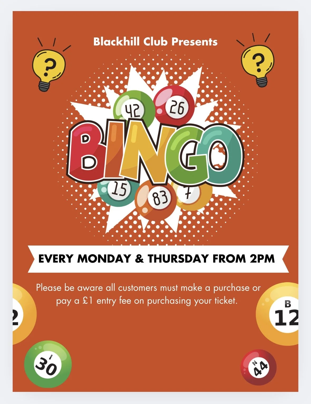 Every Monday and Thursday from 2pm we will be hosting bingo with cash prizes. Please be aware that customers must make a purchase or pay a Β£1 entry fee when entering.
